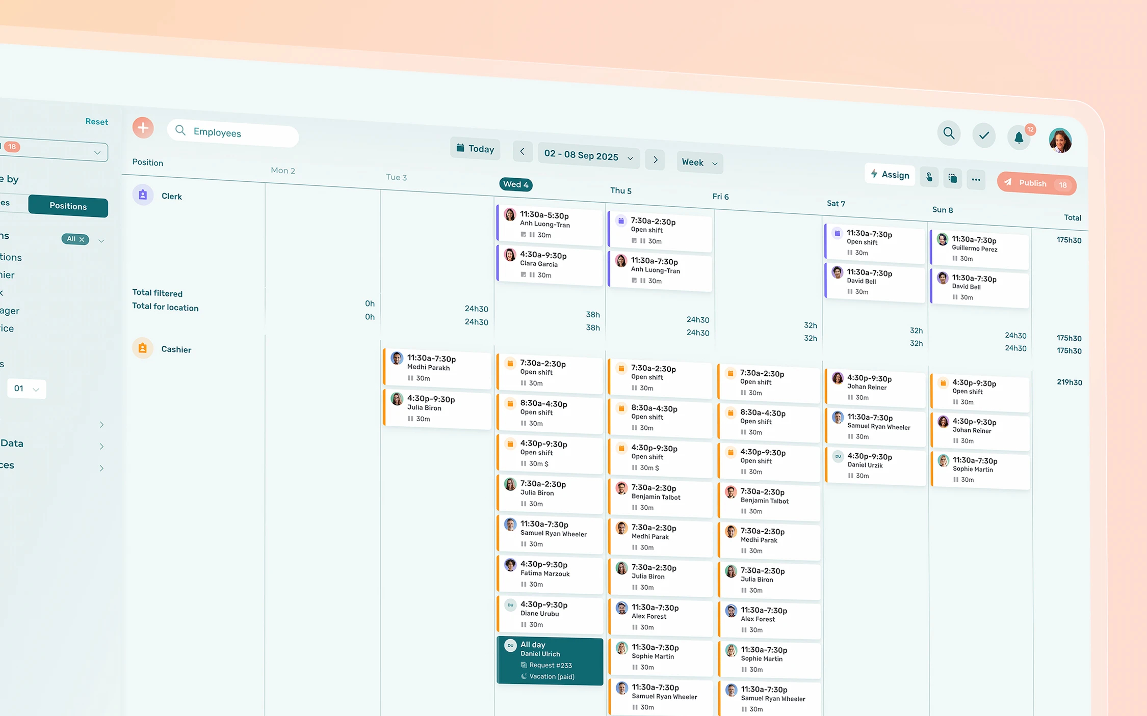 This new view lets managers build schedules based on the staffing needs of each role rather than starting from individual employees. This helps them quickly verify that every role has proper coverage. Available directly in the schedule, it offers a simple and familiar way to structure staffing based on real workplace needs.