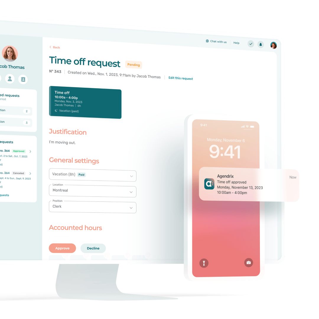 Agendrix lets your employees submit time off requests right in the app, where you can then manage them and respond.