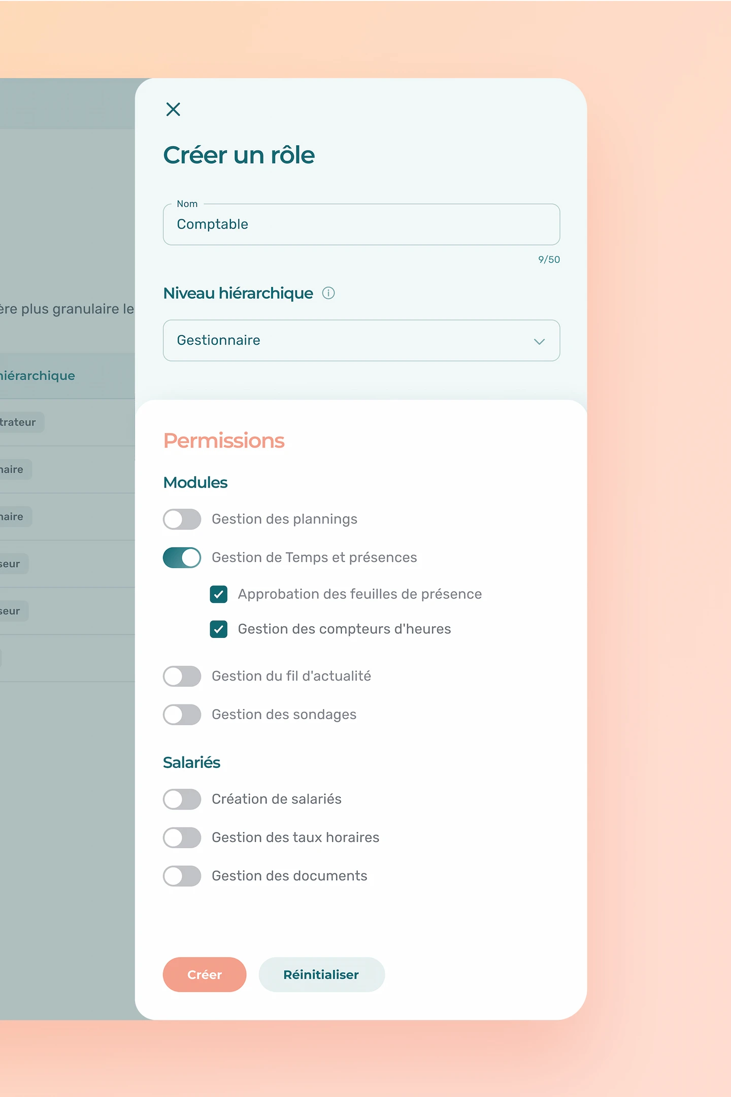 Notez qu’il ne sera pas possible de créer un rôle personnalisé à partir des niveaux hiérarchiques de salarié ou d’administrateur. L’objectif de la fonctionnalité était d’offrir plus de flexibilité en matière de gestion des rôles intermédiaires sans compromettre la simplicité générale des rôles.