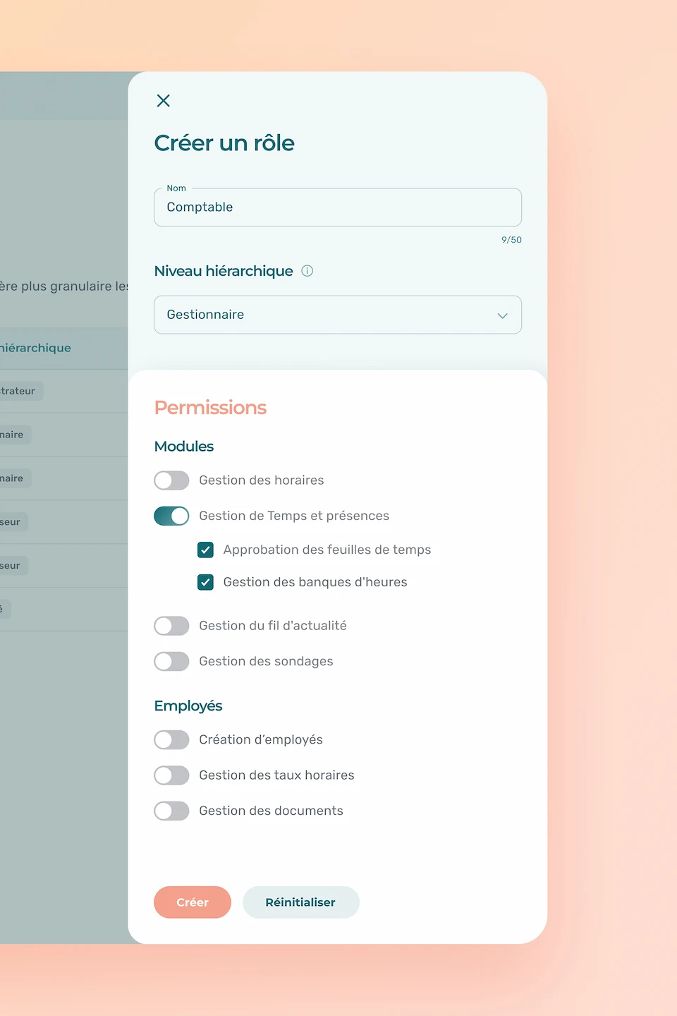 Notez qu’il ne sera pas possible de créer un rôle personnalisé à partir des niveaux hiérarchiques d’employé ou d’administrateur. L’objectif de la fonctionnalité était d’offrir plus de flexibilité en matière de gestion des rôles intermédiaires sans compromettre la simplicité générale des rôles.